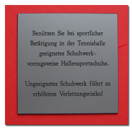 - Material:Acrylex - Gravierplatten werden aus Stoffen hergestellt, welche unter extremen Bedingungen auf Beständigkeit gegen Alterung getestet wurden. Es wurde festgestellt, das Acrylex über einen langen Zeitraum eine brillante Oberfläche sowie seine physikalischen Eigenschaften beibehält und gegen UV- Strahlung sehr widerstandsfähig ist